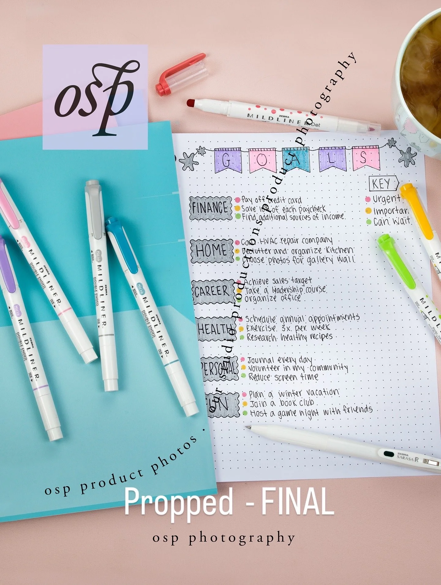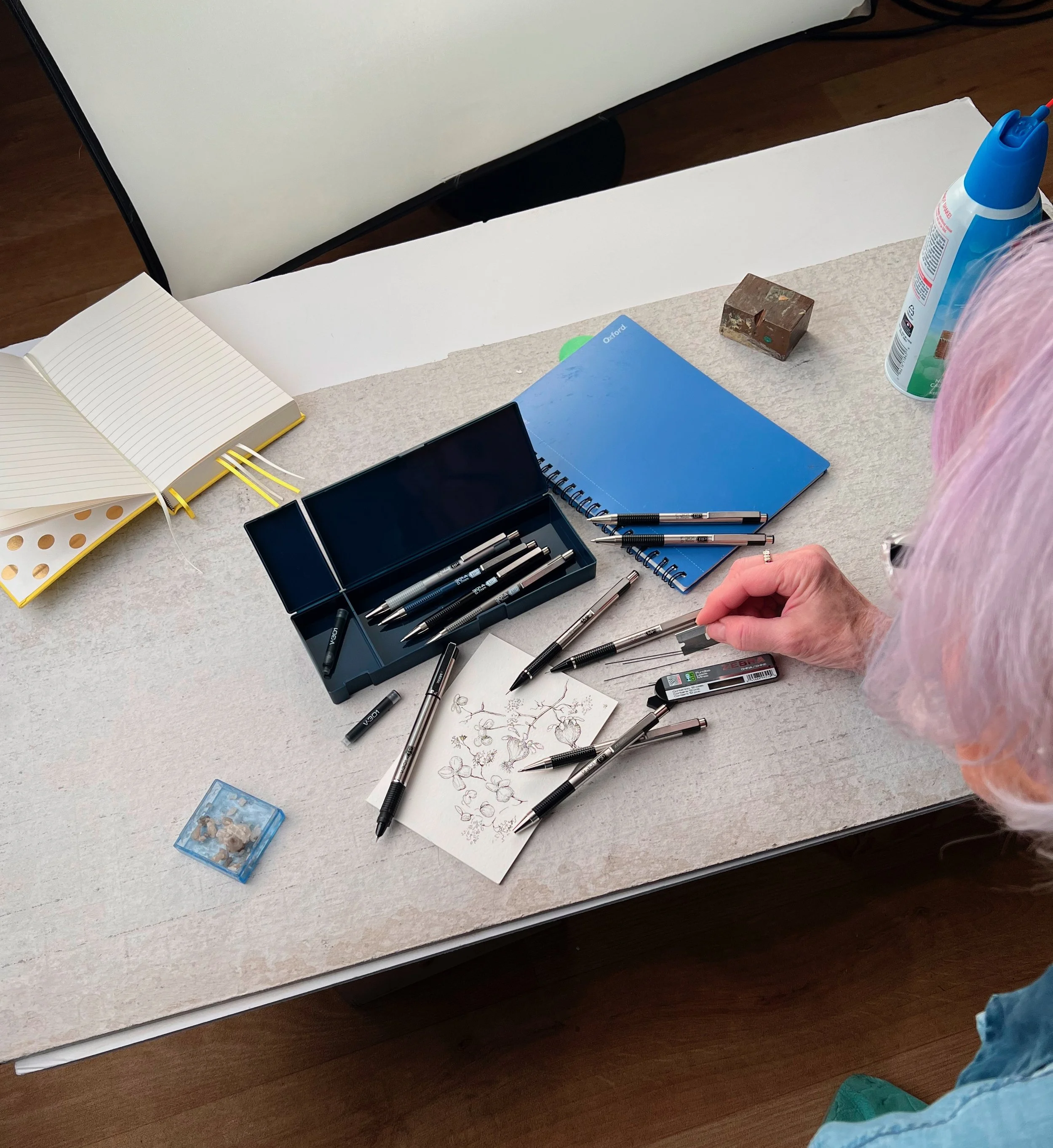Photo set-up for lifestyle product of pens and illustration using pens.